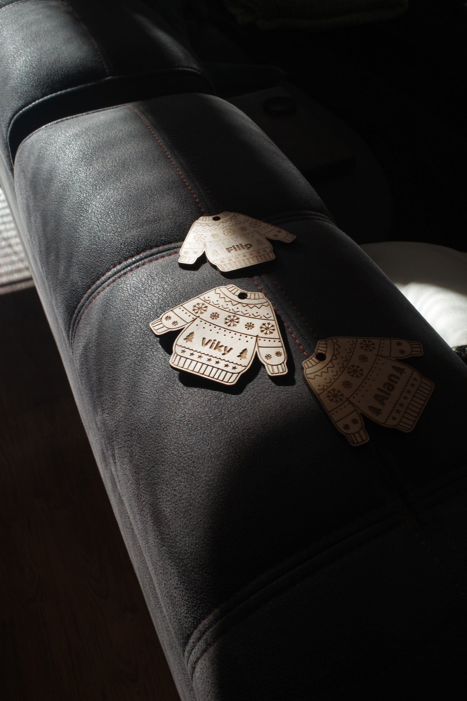Rozkošná drevená vianočná ozdoba v tvare zimného svetríka, ideálna na spestrenie vianočného stromčeka alebo ako originálna menovka na darček. Každý kus je vyrobený z kvalitnej preglejky a precízne gravírovaný detailnými vianočnými motívmi – vločky, hviezdičky či stromčeky.