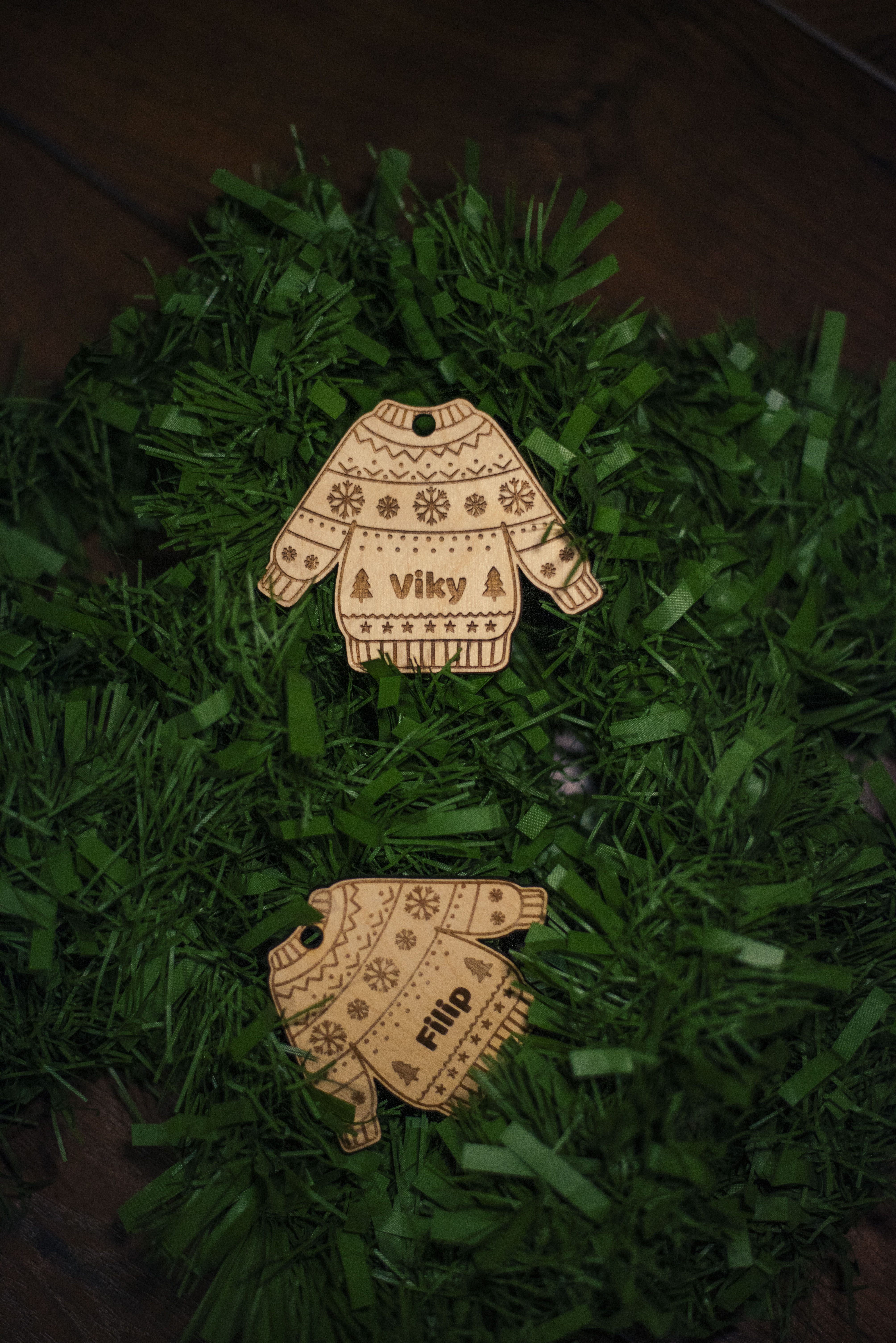 Drevená vianočná ozdoba – Svetrík s menom (personalizovaná)